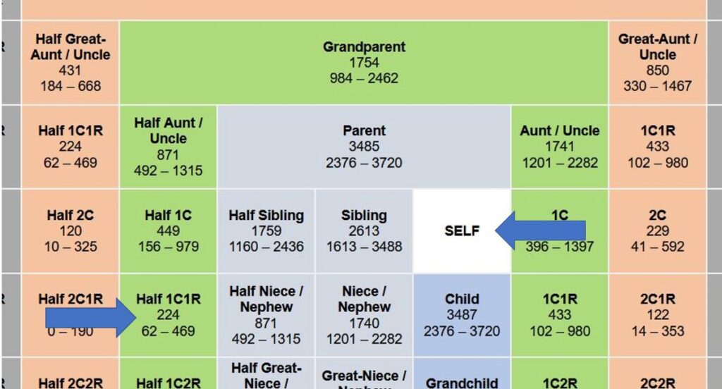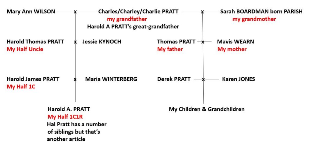 Self is me (Derek Pratt) and Half 1C1R is Half First Cousin Once Removed. My Parent is my father (Thomas PRATT b. 1919), my Grandparent is Charles PRATT (1871-1924). Then my half Uncle is Harold Thomas PRATT, my Half First Cousin is Harold James. His son is Harold Alan PRATT who is my Half First Cousin once removed. Or to make it more visual