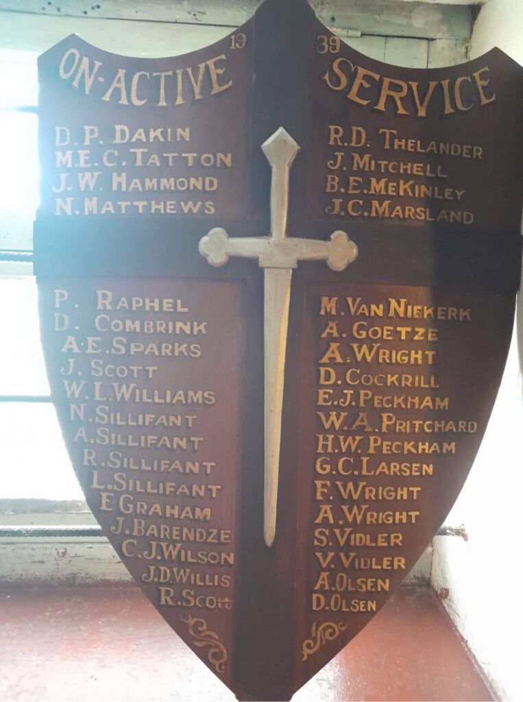 I was approached by the part-time secretary at All Saints’ Church in Roodebloem, Woodstock.  She was clearing out the church cellar and found the two shields pictured below.  They have 150 names on them and they both have a heading ‘On Active Service’ but one has the year 1939 on it.  I suspect that they were placed on the wall of the church so that worshippers could prayer for the safety of these men on active service.  The secretary asked me how she could find out more about these people.  Unfortunately, there are only initials and no first names and many of the surnames are quite common names like BROWN and WILLIAMS.  I have been doing some searches for the less common names and found quite a few who were baptised and married in All Saints Church but others I could find no entries on www.familysearch.org , www.gendatabase.com and NAAIRS.